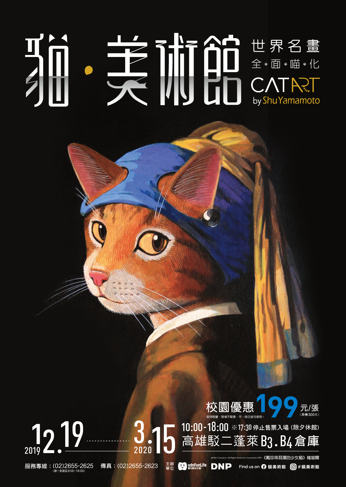 (三)展覽介紹:「貓•美術館」致力於提供一個全新的世界觀,我們將以趣味的手法帶領大家認識「貓界」,透過橫跨東西洋藝術史的藝術瑰寶,全面「喵化你的視界」!「貓•美術館」首次展出60件『CATART by Shu Yamamoto 世界名畫•全面喵化』的藝術創作,其中包含維喵爾《戴珍珠耳環的少女貓》、喵文西《貓那麗莎》、喵勒《拾貓草》等原創真跡作品,從「古代貓文明」經過「文藝喵復興」、「巴洛克」、「喵歐古典主義・浪漫主義・寫實主義」、「印象派」到「20世紀美術」、「日本及亞洲美術」等展區來呈現貓藝術。在山本修ShuYamamoto先生藝術創作的帶領下,透過橫跨東西藝術史的曠世巨作,正式進入「貓的文藝世界」,感受深度、豐富且高尚的貓文化。這座「貓•美術館」除了觀賞「貓畫」外,還會不知不覺地受到「喵化」魔法的影響,變身成為「貓界」的一員!在這個精心打造、超級療癒的「貓界」裡,可以走入名畫變成貓,還有巨型玻璃花窗「光之喵」、專屬於貓咪的「貓浮宮」、毛線打造的「貓樂園」、塗鴉玩樂的「貓創空間」等,讓你從貓的視角重新去認識世界,展現出各式各樣的慵懶、俏皮「貓態」,隨心所欲地以貓的身份,盡情地沈浸在美學饗宴中!在「貓•美術館」裡,不用理解作品的技巧,不用思考作品的背景,不用定義作品的價值;喜歡,就一直盯著看,這就是「貓•美術館」的真理。