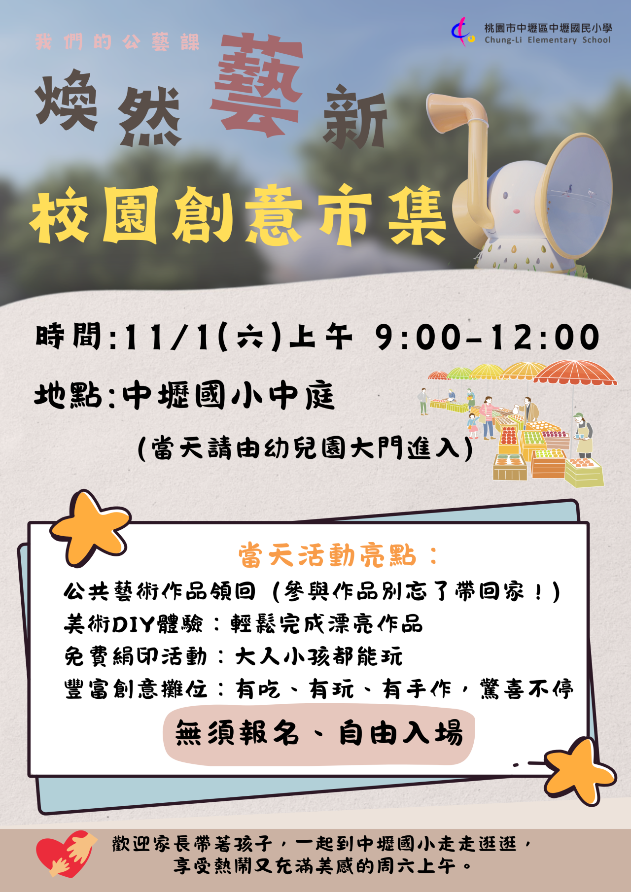 本校將於 11/1(六)上午 9:00–12:00 在校園中庭舉辦熱鬧又好玩的 校園創意市集,誠摯邀請您與孩子一起前來共度美好週末時光!